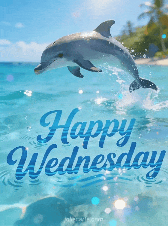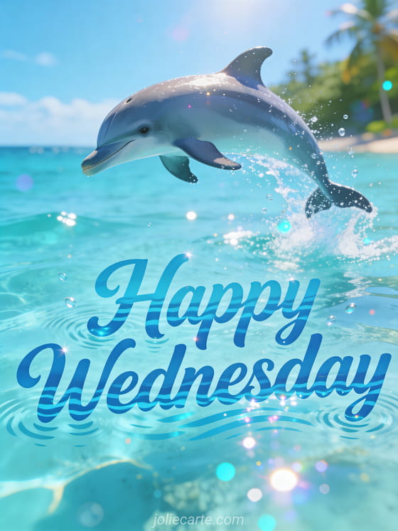Share a joyful happy Wednesday wish with this energetic animated gif card featuring a playful dolphin jumping out of crystal clear turquoise water. Discover also good little wednesday coffee or animated kiss gif happy wednesday for more Wednesday inspiration.