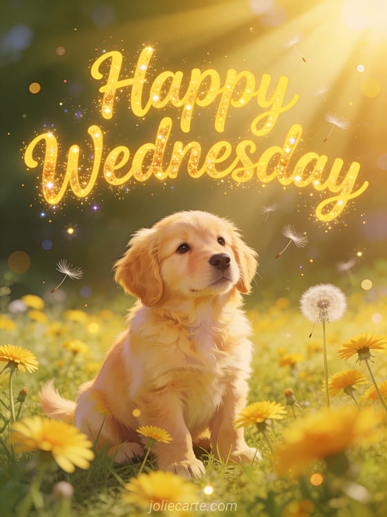 Send this cheerful happy Wednesday emoji card with an adorable golden retriever puppy in a field of yellow daisies. Discover also a Wednesday kisses gifs card or a happy Wednesday beautiful image card.