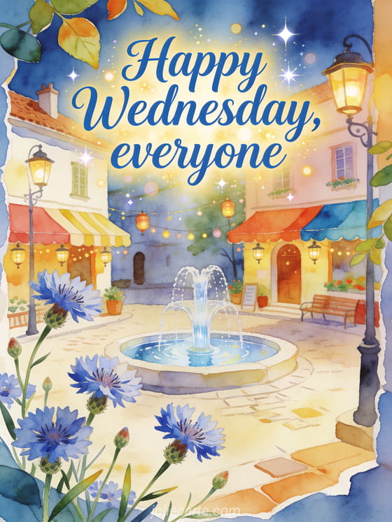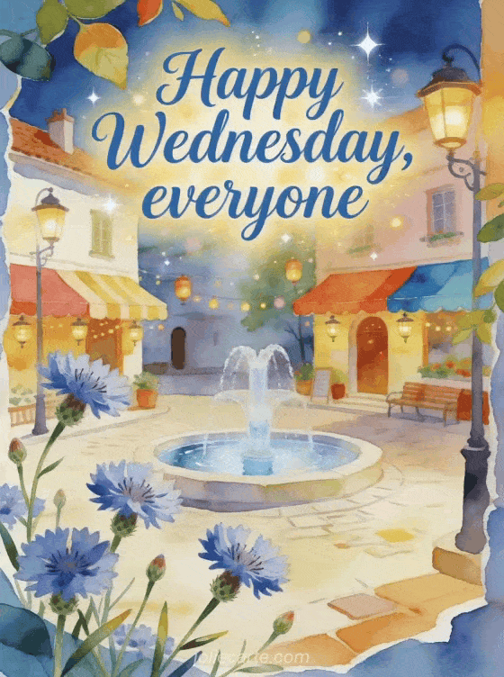 Share a welcoming Wednesday with watercolor knapweed flowers, lively leaves, colorful awnings, lanterns and a clear fountain in a small village square. You can also send a sunny happy Wednesday image, animated happy Wednesday images or a good morning happy Wednesday gif.