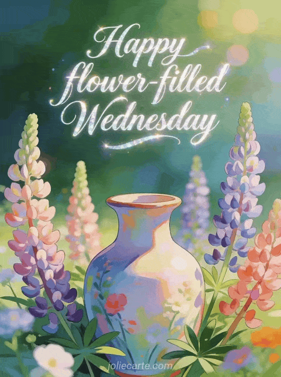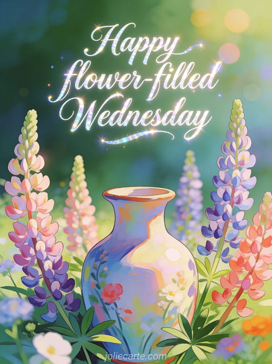 Share a colorful happy Wednesday greeting with graceful script, shimmering highlights, blooming lupines around a painted vase, and dreamy spring bokeh. Discover also a good morning good morning happy Wednesday image, happy Wednesday photos, or a happy Wednesday bouquet.