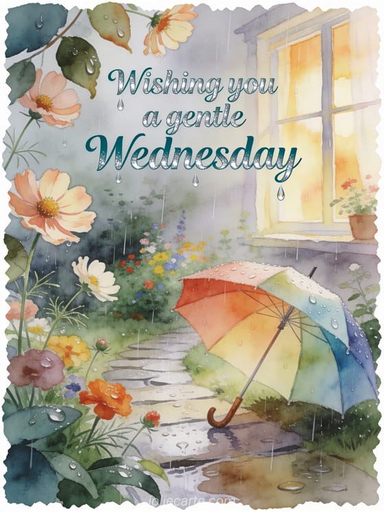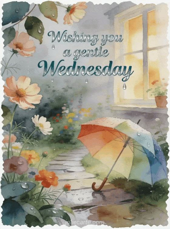 Share a happy Wednesday in the rain gif with deep teal lettering, cosmos flowers, wet leaves, an open umbrella and a rain-kissed garden path. You can also send a sparkling happy Wednesday gif, a happy Wednesday sun gif or a happy Wednesday image search.