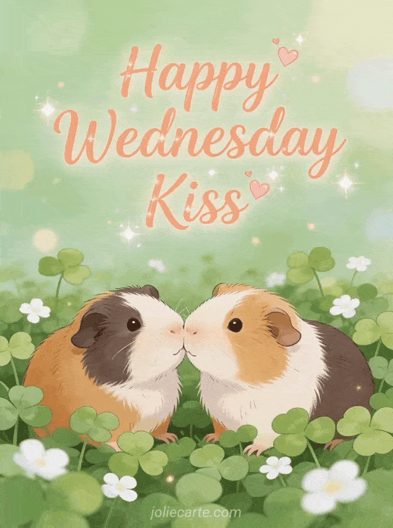 Share a sweet Wednesday kiss with this adorable card showing two guinea pigs nuzzling in a soft clover bed. Discover also a coffee good morning happy wednesday or a sunny wednesday photo card.