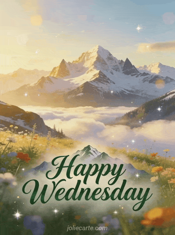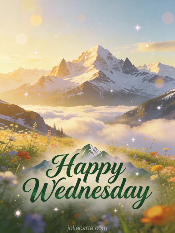 Send a peaceful happy Wednesday greeting with snow-capped alpine peaks, a wildflower meadow and golden morning light above drifting clouds. Discover also animated happy Wednesday images, good morning it's Wednesday or good morning my beautiful Wednesday.