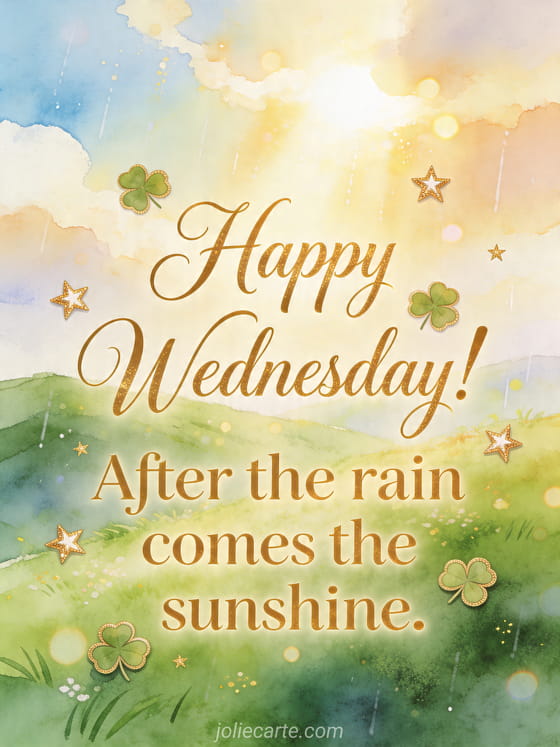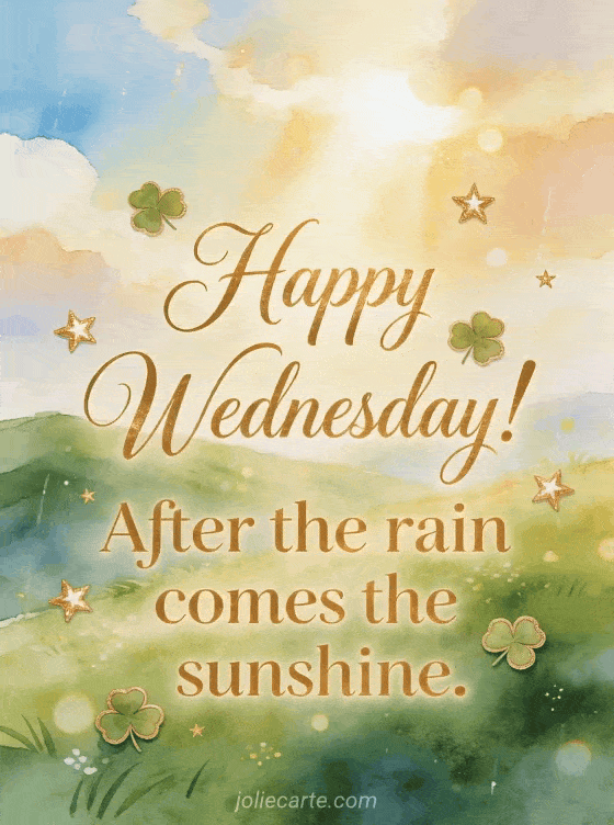 Share this free Happy Wednesday! After the rain comes the sunshine. card and send a joyful message in seconds. Personalize it online and discover also nice wednesday evening image, good wednesday evening image and happy wednesday kisses gif.