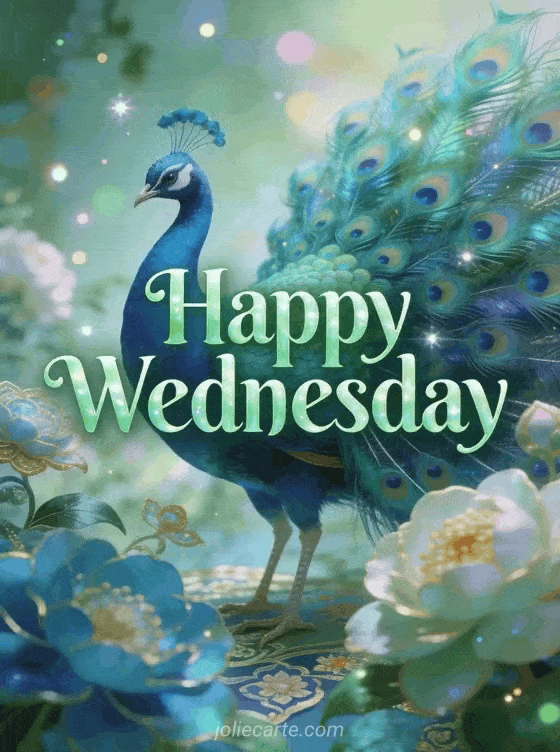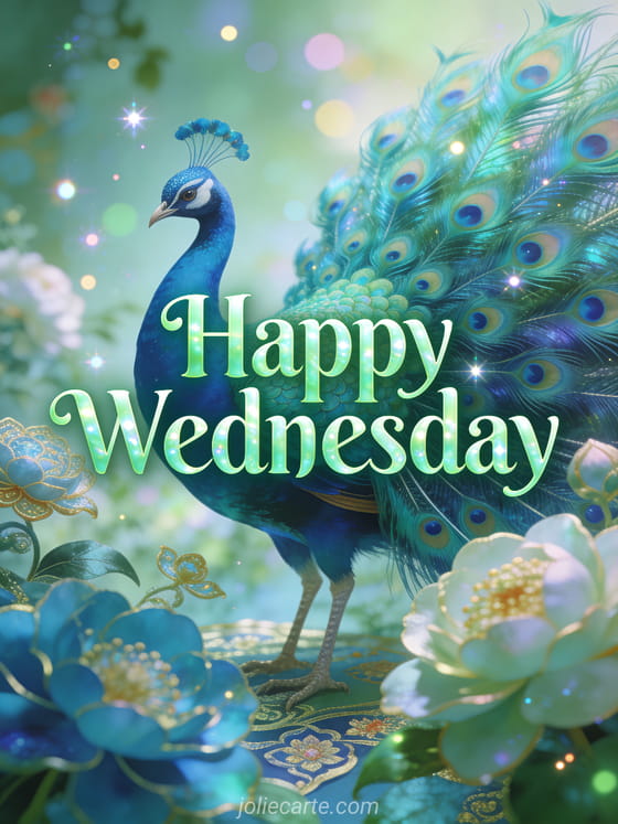 Send an elegant happy Wednesday greeting with a majestic peacock displaying its iridescent feathers in a royal garden with ornate flowers. Discover also a happy Wednesday bouquet, a happy Wednesday kisses animated gif or a happy Wednesday cat gif.