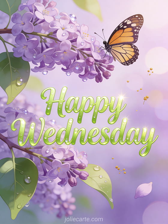 Welcome spring on this Wednesday with this beautiful card of a monarch butterfly resting on blooming lilac with dewy morning sparkle. Discover also a happy wednesday everyone or a happy wednesday kiss card.