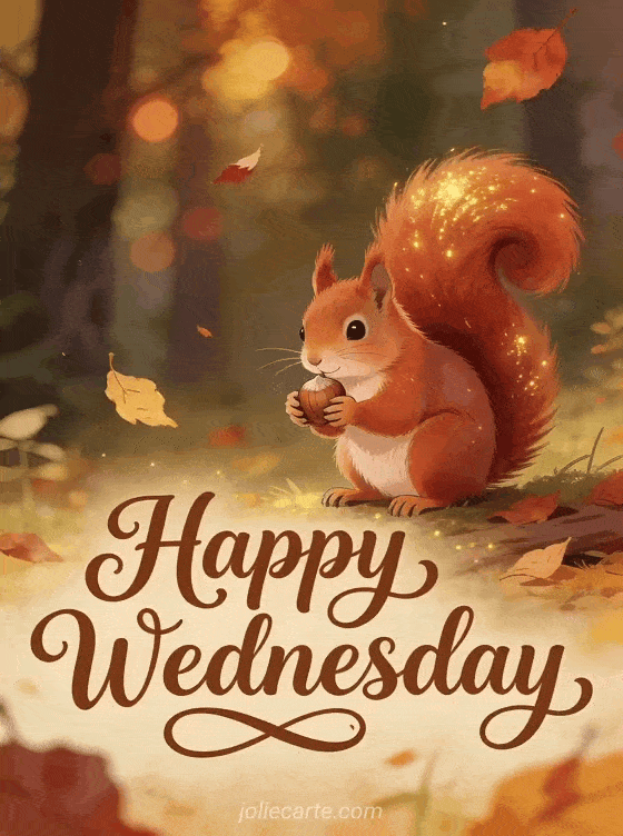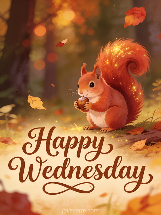 Send an adorable happy Wednesday greeting with a fluffy red squirrel holding a hazelnut, its bushy tail curled in warm autumn forest light. Discover also happy Wednesday animated gif, every day I think of you yosa prod or heart heart tenderness happy wednesday kisses.
