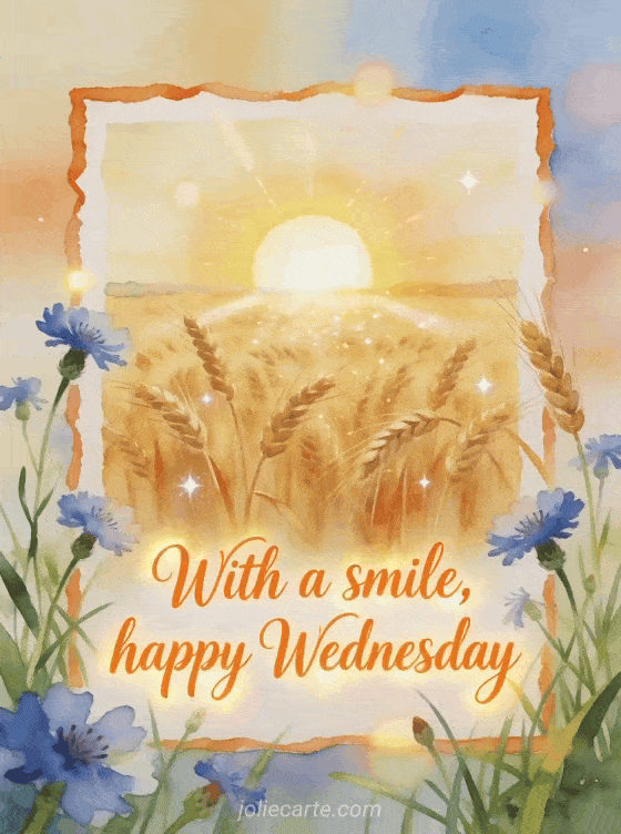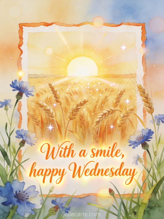 Share a bright happy Wednesday message with a rising sun over a golden wheat field, fresh grass, and cornflowers in watercolor. Discover also happy Wednesday image search, happy Wednesday my friends text, or happy Wednesday afternoon gif.