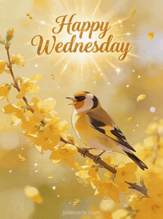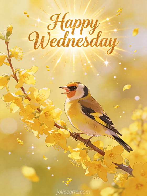 Brighten the middle of the week with this radiant happy Wednesday card. A cheerful goldfinch perches on a branch of yellow forsythia flowers in a bright sunny spring scene with vibrant yellow tones. Discover also a good morning happy Wednesday card or a happy Wednesday have a nice day card.