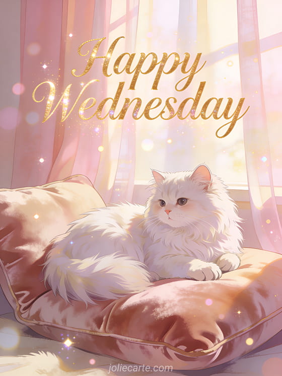 Wish someone a happy Wednesday with this tender card featuring a fluffy white Persian cat on a velvet cushion. Discover also funny good morning happy wednesday or happy wednesday friends image.