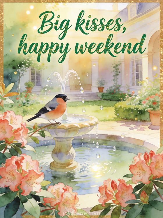 Send big kisses for the weekend with a watercolor card where rhododendrons, a bullfinch and a garden fountain create a tender courtyard scene. You can also share funny have a nice weekend humor, send a gif happy weekend funny or choose a nice weekend.