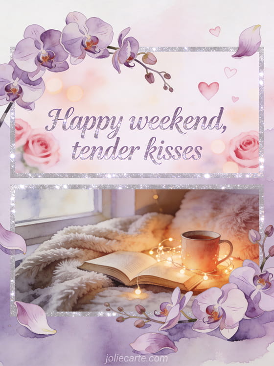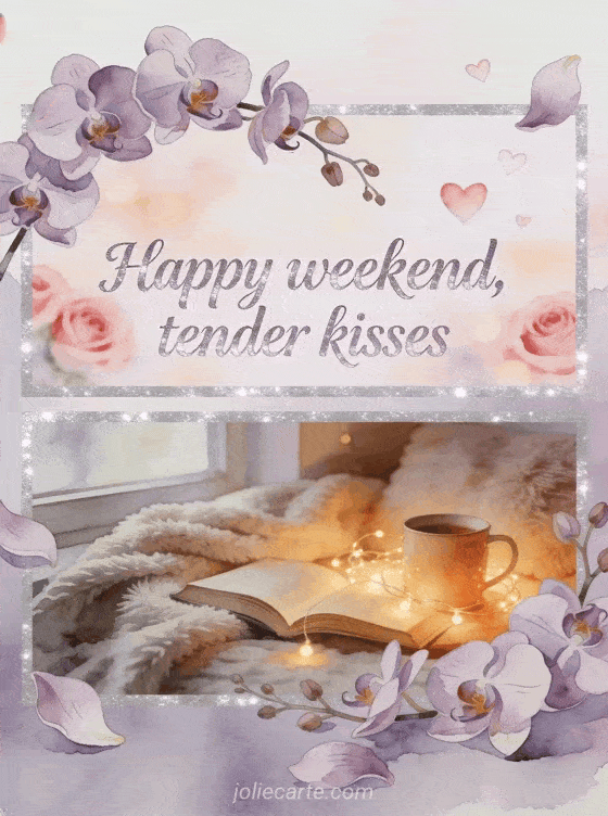 Share a happy weekend kisses gif image with lavender script, orchid petals, a cozy reading nook, plush plaid, warm cup, fairy lights and soft hearts. You can also send great weekend and kisses, great weekend big kisses or weekend sweet kisses.