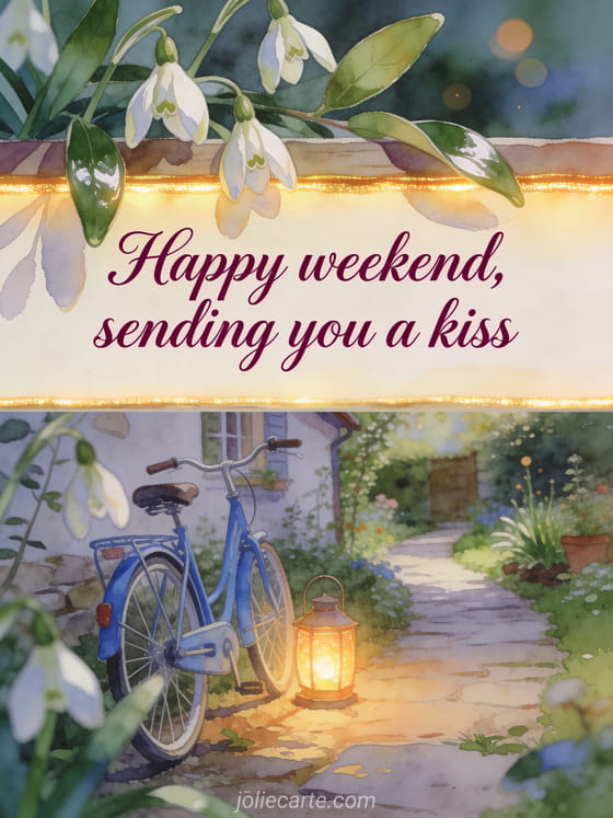 Send a tender happy weekend greeting with a kiss, snowdrop flowers leaning over the border and a cottage garden path with a blue bicycle and glowing lantern. Discover also have a good weekend kisses, tender thoughts happy weekend kisses or good weekend kisses.