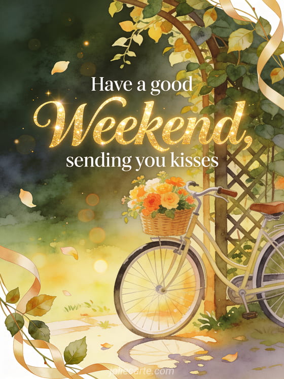 Share a tender weekend message with champagne glow, a vintage bicycle, a leafy garden arbor and a basket of colorful blooms. Discover also i wish you a nice weekend, great weekend everyone kisses or good weekend image.
