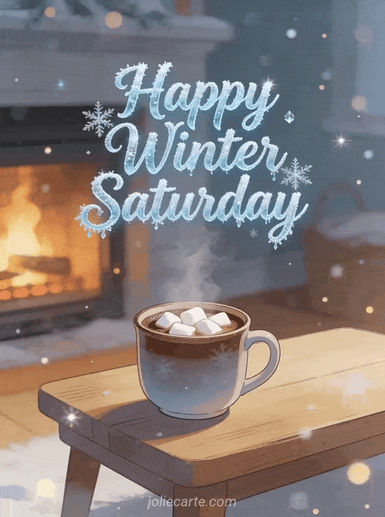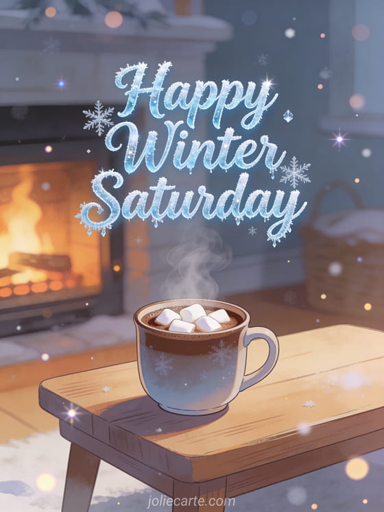 Celebrate a cozy winter Saturday with this warm card featuring steaming hot chocolate with marshmallows by the fireplace glow in the morning light. Discover also a happy Saturday and happy weekend funny, a happy Saturday to you or a happy Saturday card.