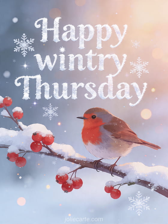 Send a Happy wintry Thursday card with a robin on a snowy branch and red berries for a cozy seasonal mood. Discover also happy thursday animated, coffee happy sunny thursday and humorous happy thursday funny.