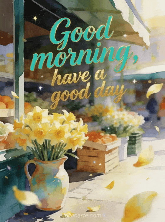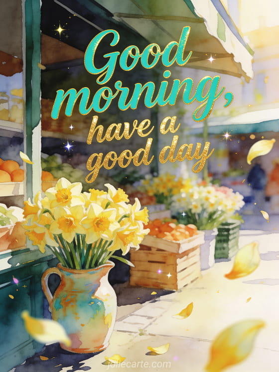 Send an energetic good morning and have a good day greeting with bright turquoise script, golden shine, a sunny market corner, daffodil bunches, a painted ceramic jug and petals floating forward. You can also share a good day snow gif, a good day image with kisses or a good day sun gif.