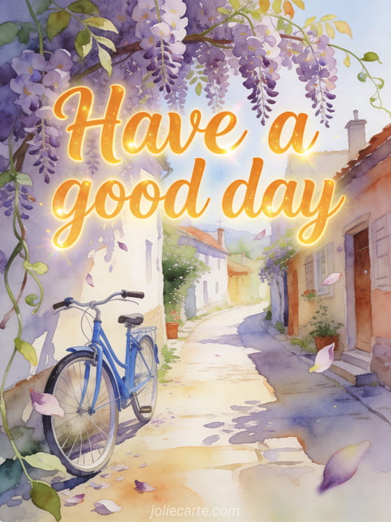 Wish a good day with a charming village lane, wisteria blossoms arching over a blue bicycle and fresh uplifting watercolor colors. Discover also a beautiful day kisses gif, good day photos gif or good day kisses animated gifs.