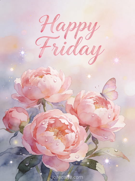 Start your Friday with this beautiful card featuring lush pink peonies with morning dew and a gentle butterfly. See also good morning it's friday or happy friday gif.