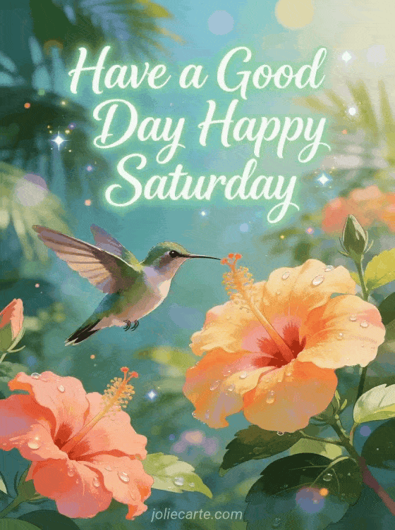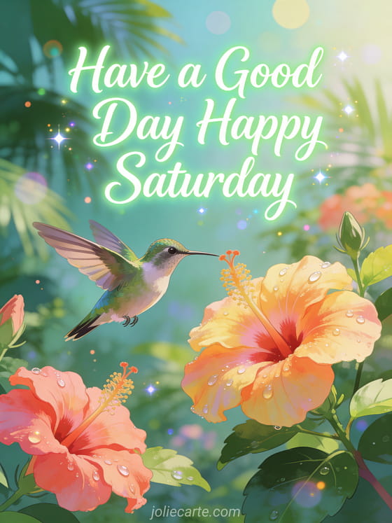 Send a joyful Saturday greeting with a beautiful hummingbird hovering near hibiscus flowers in a tropical garden. A vibrant way to wish someone a wonderful Saturday. Discover also a cheerful Saturday card or a funny Saturday card.
