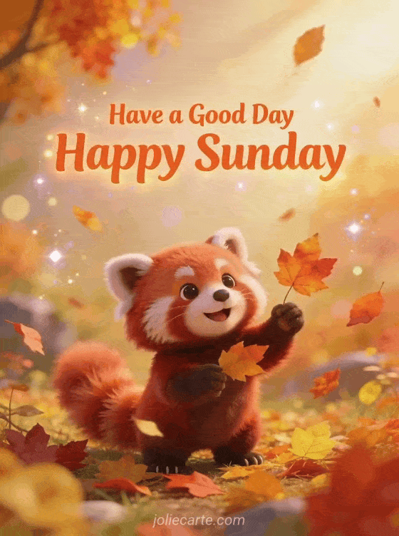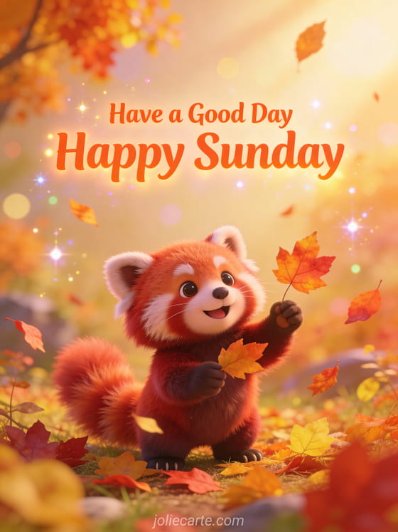 Send a cheerful Sunday greeting with an adorable red panda playing with autumn leaves in a colorful fall setting. A playful way to wish someone a wonderful Sunday. Discover also a magical Sunday card or a sunny Sunday card.