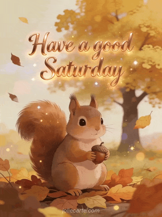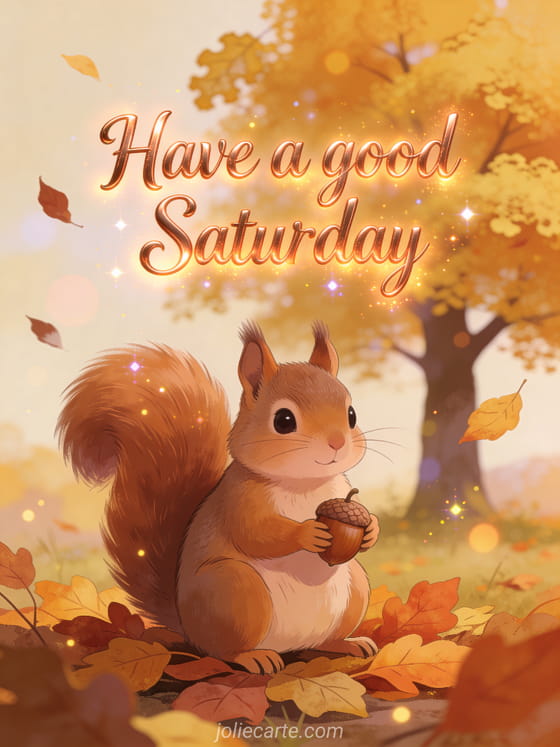 Share a cozy Saturday greeting with a cute squirrel holding an acorn, golden leaves, and a soft autumn glow. Discover also a happy Saturday big kisses card or a beautiful happy Saturday image.