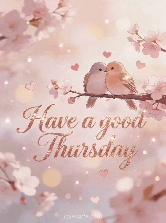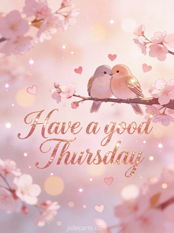 Send a sweet have a good Thursday greeting with two lovebirds cuddling on a branch, surrounded by cherry blossoms and floating hearts. Discover also a good morning happy Thursday card, a free happy thursday card or wish a happy Thursday image.