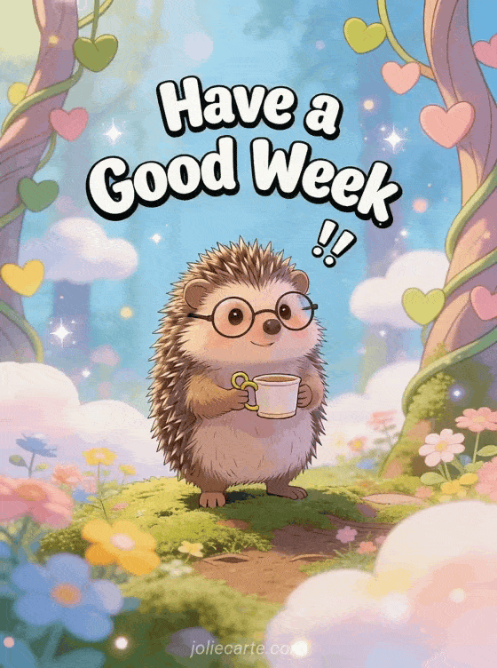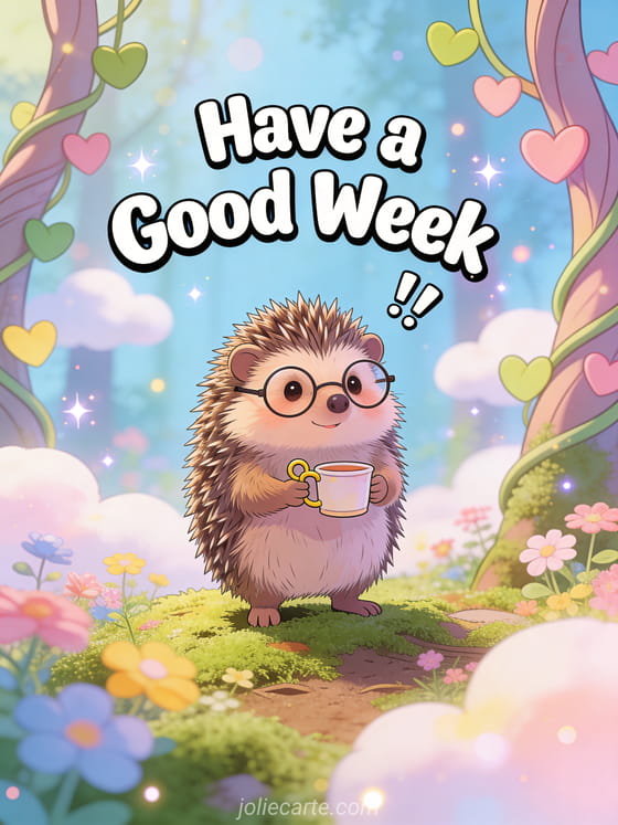 Send a cheerful good week greeting with a cute hedgehog wearing tiny glasses and holding a cup in a whimsical forest setting. A fun way to wish someone a wonderful week ahead. Discover also a good morning good week card or a good week gif.