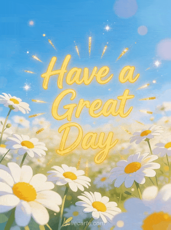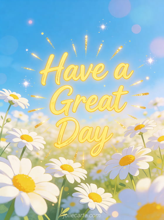 Share a joyful have a great day Monday card with a field of daisies under a bright blue sky. Send some Monday sunshine to brighten someone's day. Discover also a happy monday cat card or a funny happy monday image card.