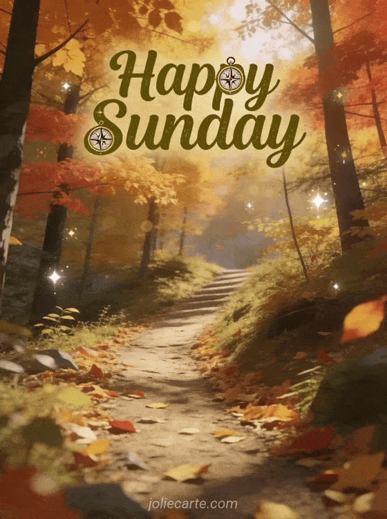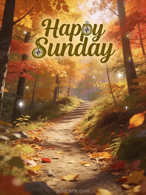 Share a fresh Sunday greeting with an autumn forest trail, golden leaves, and a peaceful adventure mood. Discover also a very happy sunday kisses card or a happy Sunday animated gifs gif.