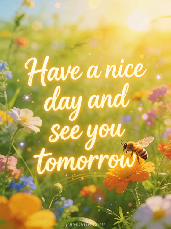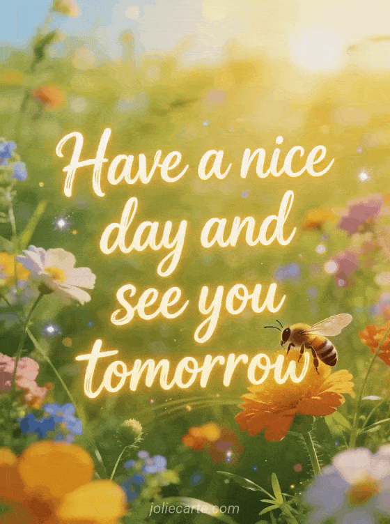 Share this bright have a nice day and see you tomorrow card with golden sunshine, colorful wildflowers, and a happy bee. You can also discover good evening and good night see you tomorrow image, good evening good night kisses see you tomorrow and landscape good evening see you tomorrow.