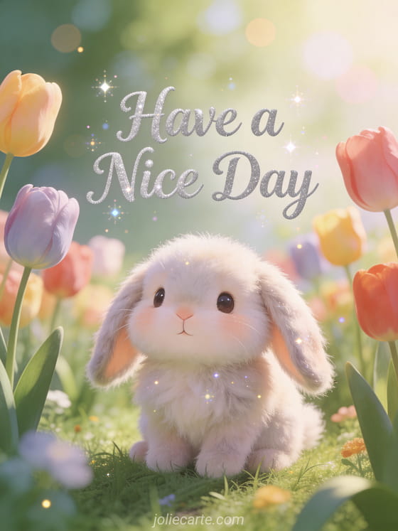 Brighten someone's day with this cute fluffy bunny and tulips card. Discover also a sunny have a nice day gif card or a good morning have a good day card.
