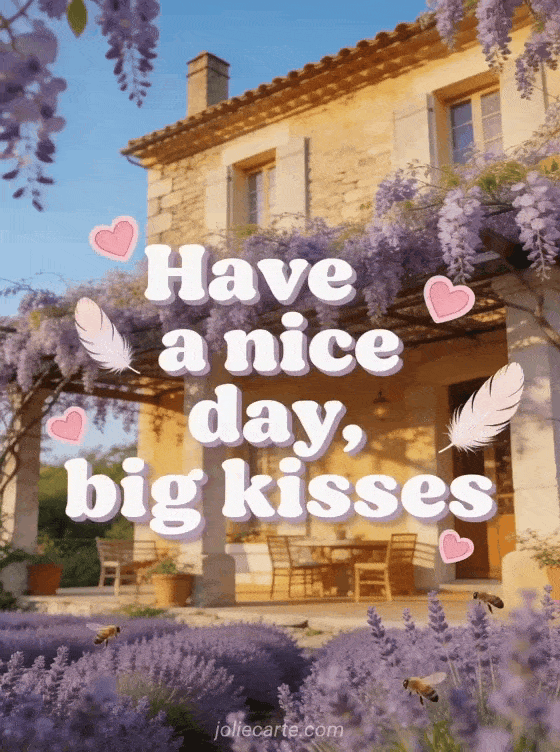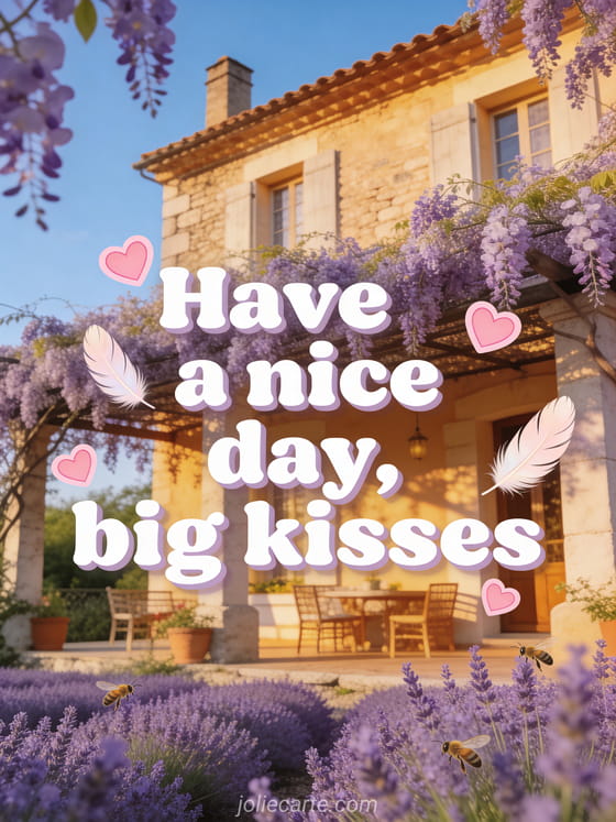 Brighten someone's day with this charming card featuring a golden stone Provencal farmhouse, lavender fields, wisteria and little bees in warm golden hour light. Discover also a good morning and have a nice day card or a have a nice day card with kisses.