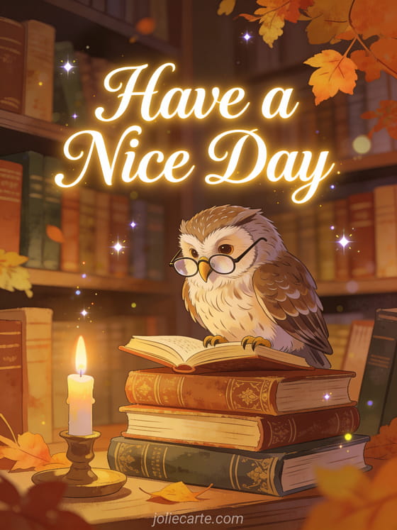 Send this charming have a nice day with a wise old owl sitting on antique books with reading glasses in an autumn library. Discover also a kisses have a nice day coffee image card or a have a nice day image card.