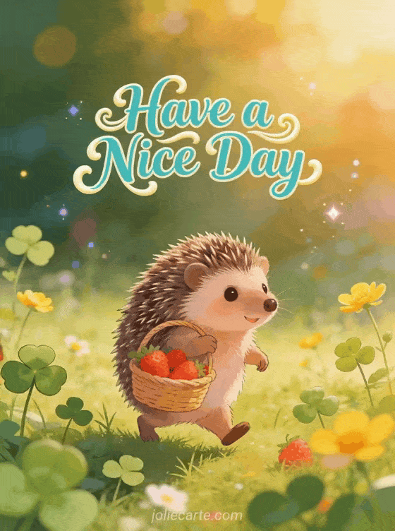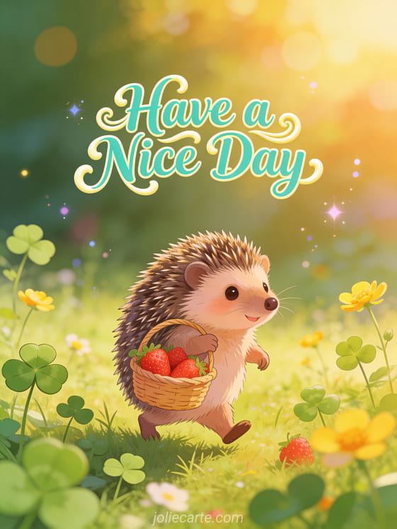Brighten someone's day with this adorable card. A cute hedgehog carries a tiny basket of strawberries through a sunlit meadow with clover and buttercups in warm golden hour light. Discover also a happy Tuesday card or a happy Tuesday greeting card.