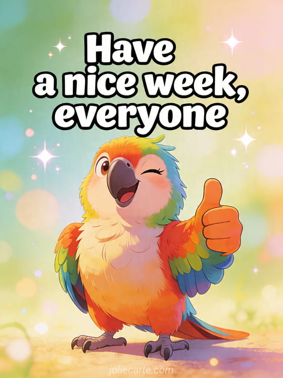 Share a cheerful wish for everyone with this mischievous parrot card full of humor. Discover also have a nice week, have a nice day and a nice week or funny good week.
