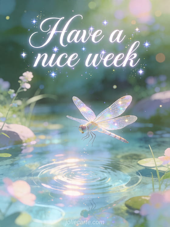 Share a magical wish for a nice week with this fairy-tale dragonfly card. Discover also have a nice week everyone humor, have a nice week or hello and good week everyone.