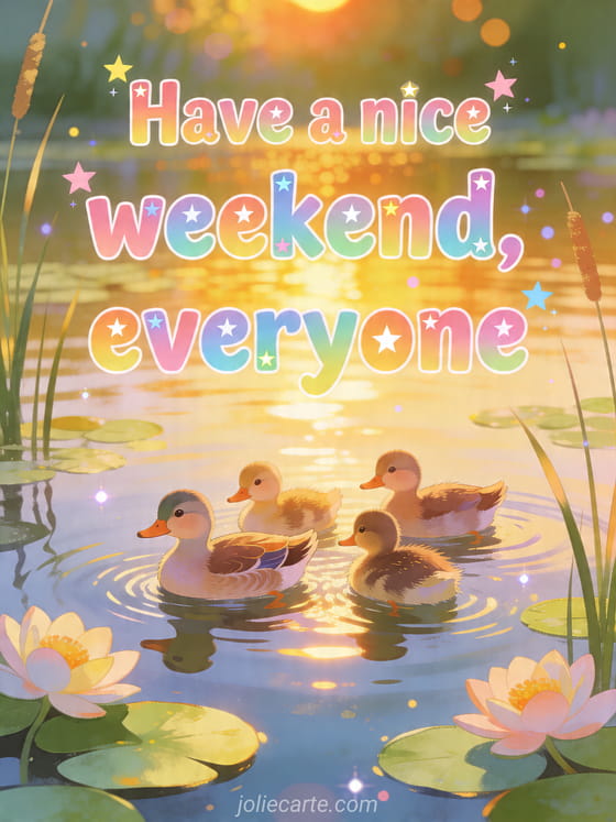 Send this have a nice weekend everyone quote card to brighten the whole group with a warm message. Discover also have a nice weekend everyone, happy weekend kisses animated gif or good weekend images.