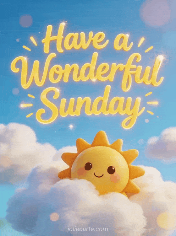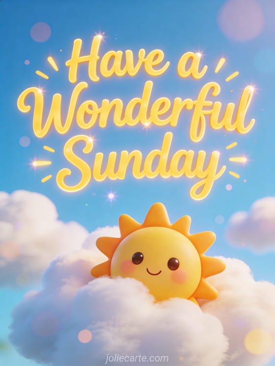 Brighten someone's Sunday with this cheerful card featuring a happy cartoon sun with a cute face peeking through fluffy clouds. Discover also a good morning sunday humor card, a tenderness happy sunday kisses card or a gif happy sunday card.