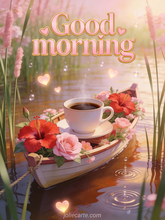 Send a warm good morning with this poetic coffee card. A steaming coffee cup sits in a flower-filled boat moored among reeds, with vibrant red and pink hibiscus, a gentle spring drizzle creating tiny circles on the water and glowing hearts floating above. Discover also a good morning seaside coffee card, a good morning kisses coffee card or a I miss you card.