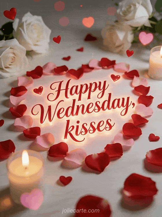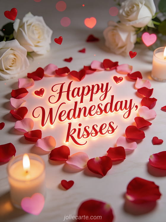 Send tender happy Wednesday kisses with red and pink heart-shaped rose petals, delicate white roses and warm candlelit romance. Discover also good night and happy Wednesday, happy Wednesday clown or little happy Wednesday image.