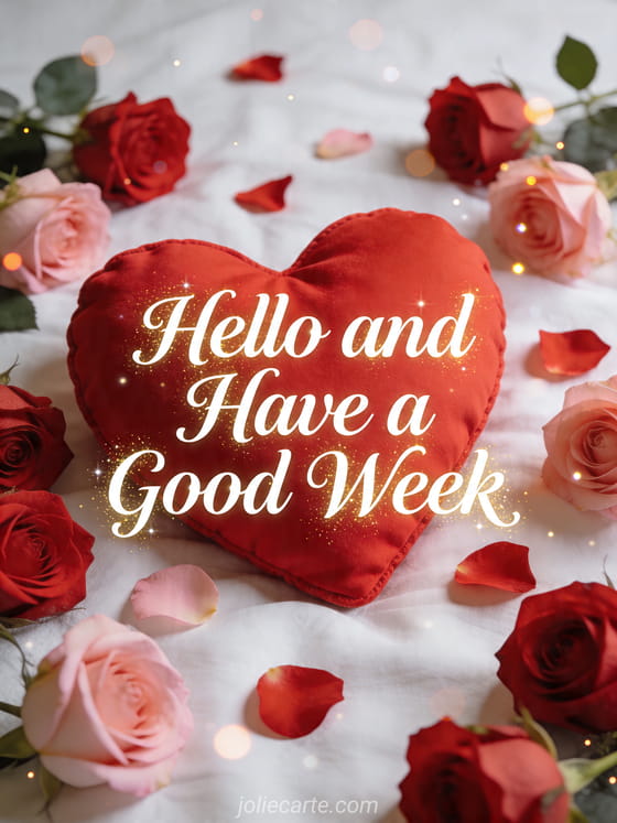 Share a romantic Hello and have a good week message with this free card showing a red heart pillow surrounded by roses and petals on white linen. You can also discover good week image, hello and good week image or nice day and good week.