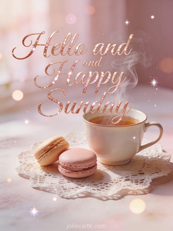 Share a delicate hello and happy Sunday greeting with rose gold lettering, a steaming teacup and sweet macarons. Discover also a cozy happy Sunday image, a happy sunday kisses image or happy Sunday everyone images.