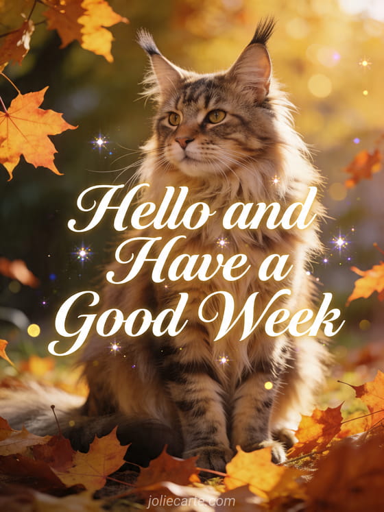 Wish someone a peaceful week with this elegant card showing a majestic Maine Coon cat sitting among autumn maple leaves in golden afternoon light. You can also discover animated good week gif gif, peaceful week or hello good week kisses image.