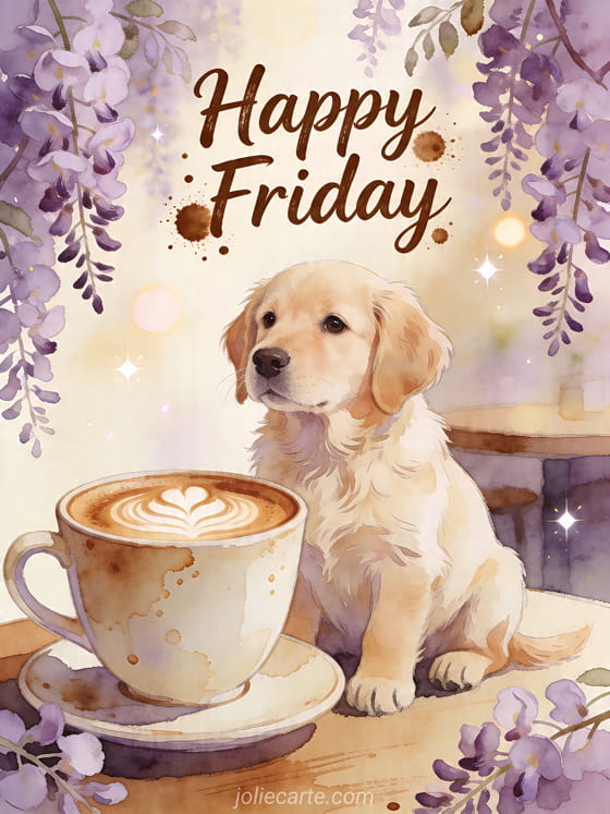 Share this warm happy Friday card with a fluffy labrador puppy, a creamy cappuccino, and beautiful wisteria flowers. You can also discover sms happy friday and have a nice weekend, good friday evening and positive hello friday.