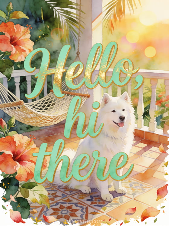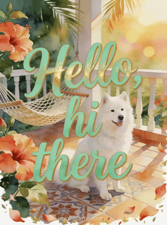 Send hello hi there gif with mint green watercolor lettering, a samoyed beside hibiscus blooms, patterned tiles, a woven hammock and warm sunrise light on a tropical veranda. You can also share a cute hi there kisses gif card, a good day hi hello gif card or a kisses hi card.