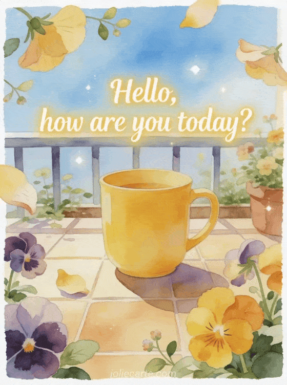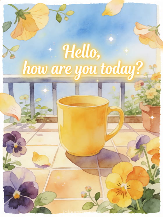 Check in gently with a sunny watercolor card showing pansy flowers around a cheerful yellow mug in a tiled balcony garden. You can also send are you okay my love, how are you my love sms or hi how are you.