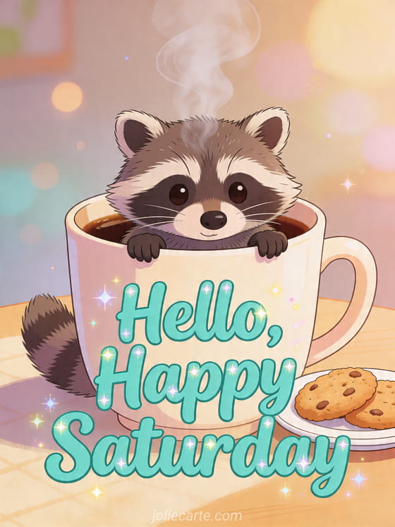 Share a cheerful Hello, Happy Saturday greeting with this free card showing a cheeky raccoon peeking out from a giant coffee mug beside cookies. You can also discover gif happy saturday, funny animated happy saturday gifs gif or beautiful saturday image.