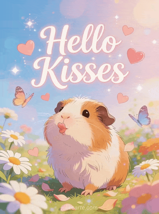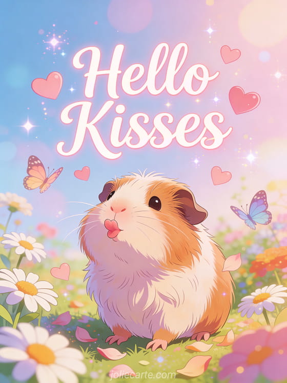 Hello kisses gif a loving animated hello with a cute guinea pig blowing kisses in a colorful garden