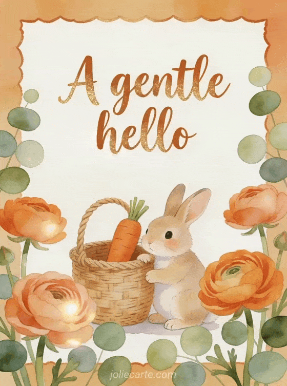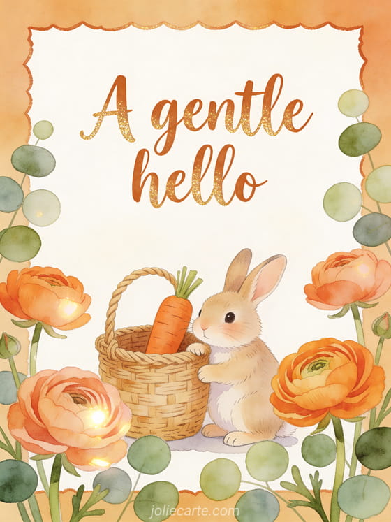 Share a gentle hello with a small rabbit beside a woven carrot basket, framed by ranunculus blooms and rounded leaves in warm watercolor colors. Discover also morning a little hello kisses, message a little hello kisses or purple hello.